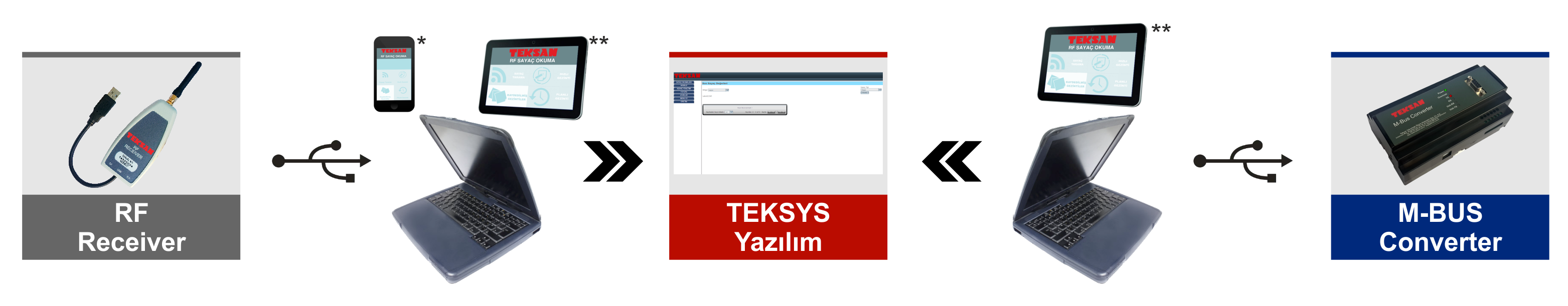 Geleneksel okuma yöntemi olan TEKSIMPLE dışında firmamız tarafından iki farklı okuma модульümüz, TEKMBUS ve TEKRF piyasada aktif olarak kullanılmaktadır.