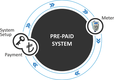 It is the system that user can take the water consumption under control with the pre-payment method except for invoicing at the end of month. The system owner makes the counter being opened by the municipality with the electromagnetic card given to the counter owner and loads credit. The counter owner who has water consumption right as long as the loaded credit amount is warned by the system when the credit is expired and loading new credit is provided. Thanks to this system, the counter owner is able to pre-buy water consumption right as he desires.